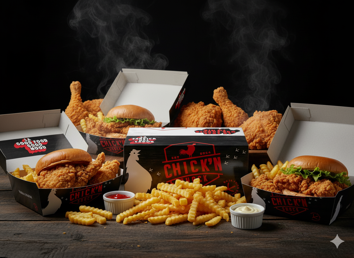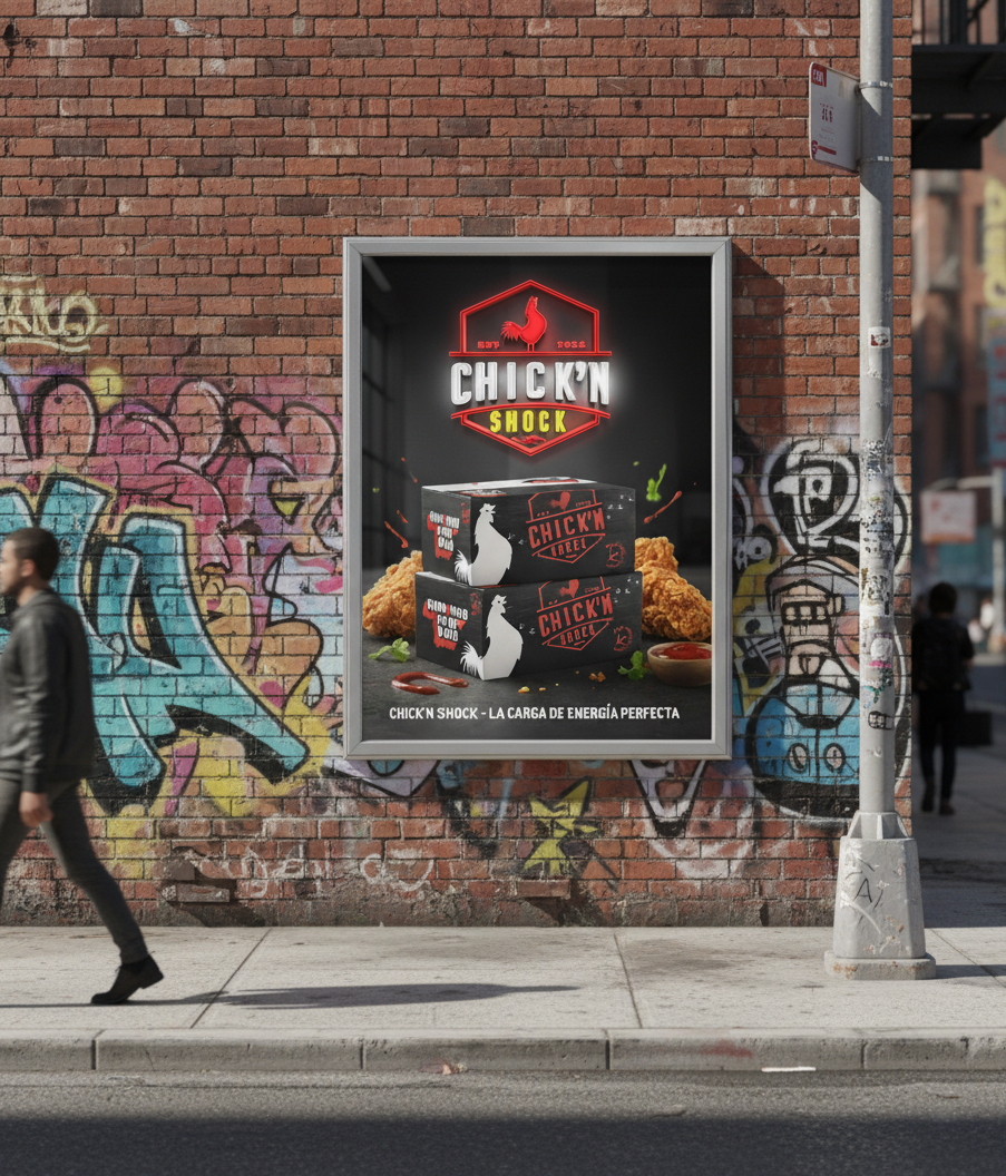 Where classic meets bold. Our branding fuses the timeless essence of fried chicken with a modern, energetic twist. On every package, every cap, and every neon sign, Chick’n Shock branding communicates an unforgettable experience: the explosion of flavor that redefines fried chicken in Baja California Sur, Mexico.
